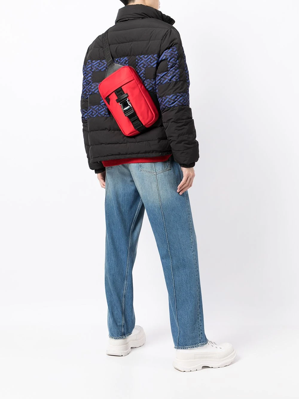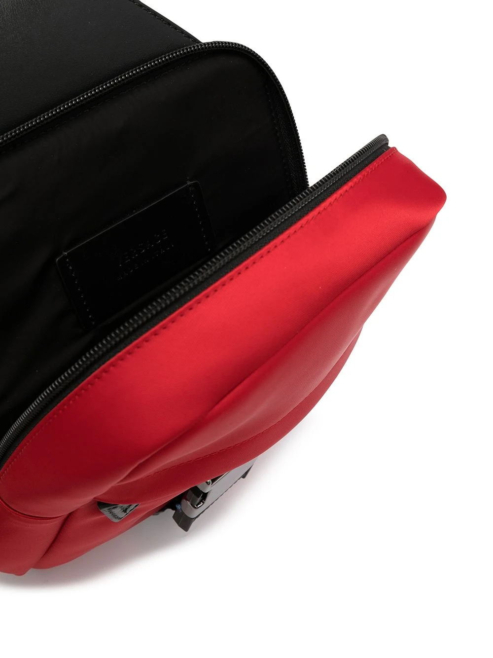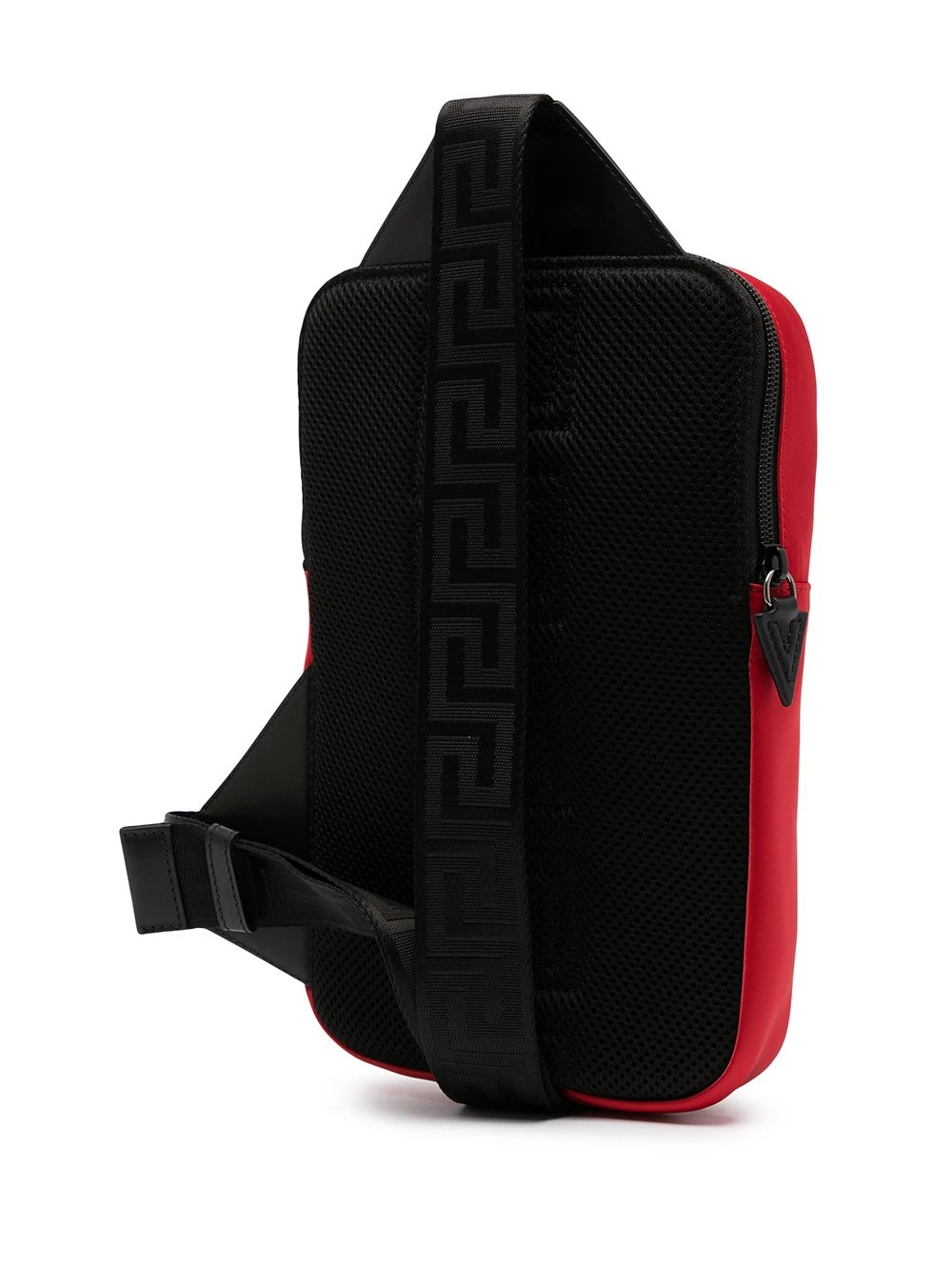 Détail de boucle à logo, détail Greca signature, fermeture zippée tout autour, bretelle portée épaule unique. Couleur : rouge.