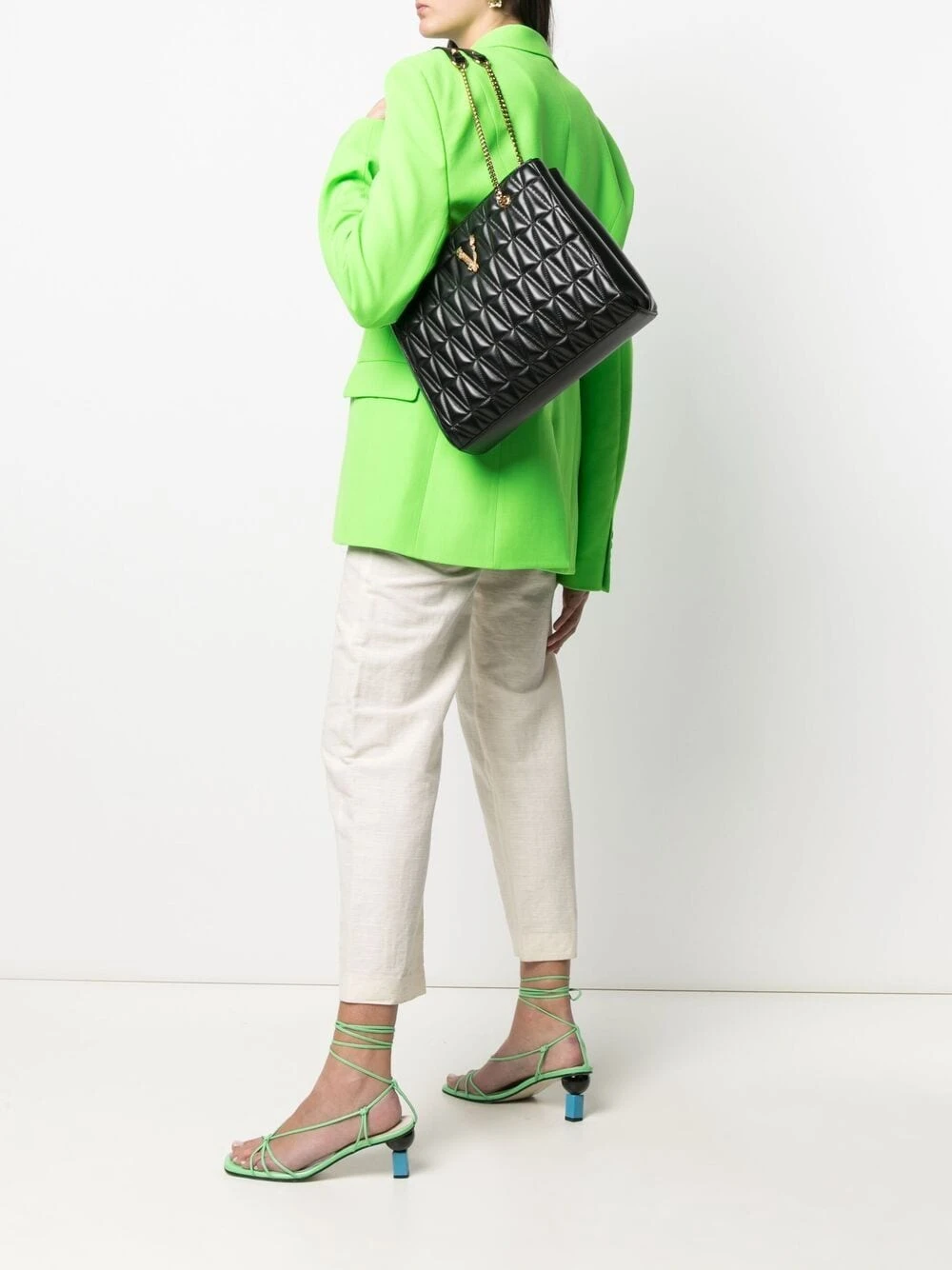 Plaque logo dorée, design matelassé, bride porté épaule en cuir et maillons de chaîne, compartiment intérieur, poches intérieures zippées. Couleur : noir. Matière : cuir.