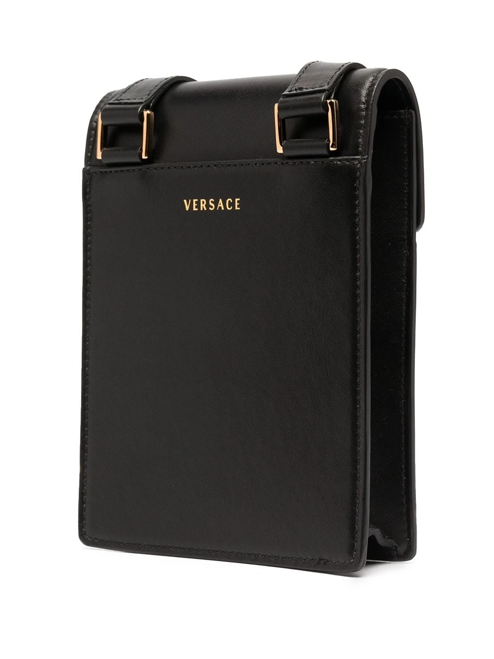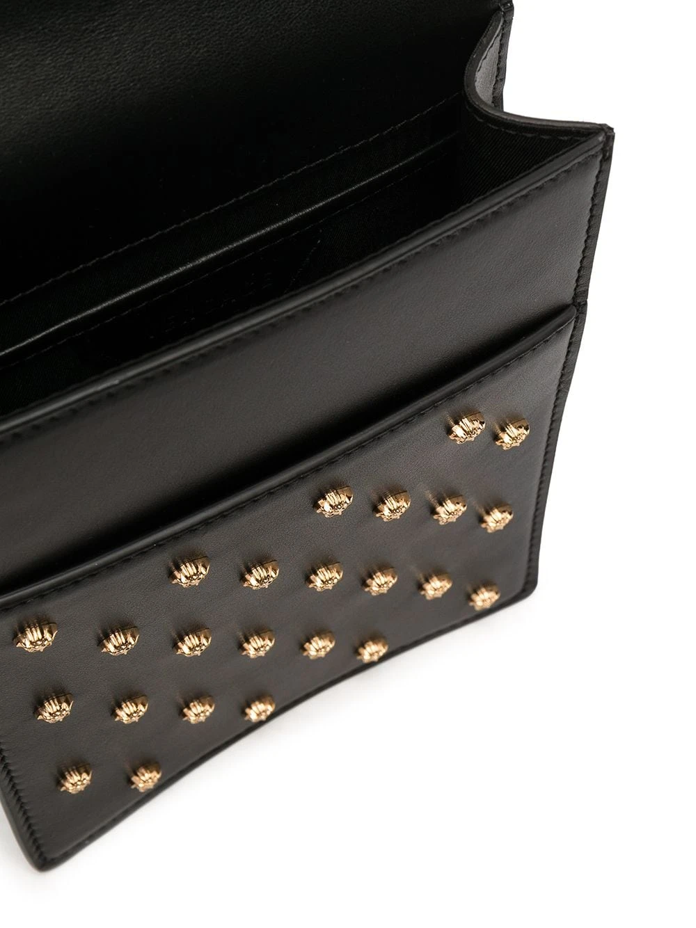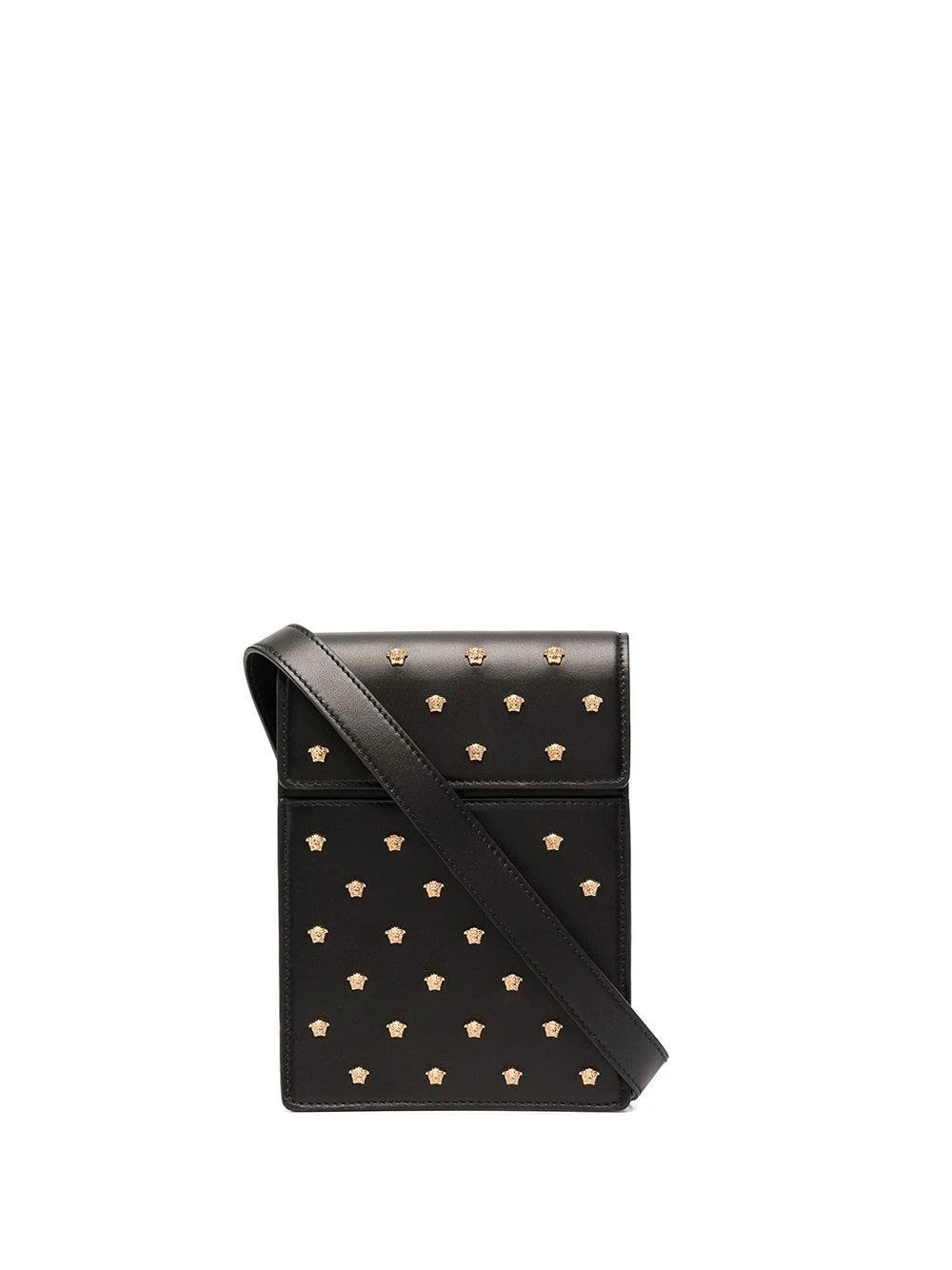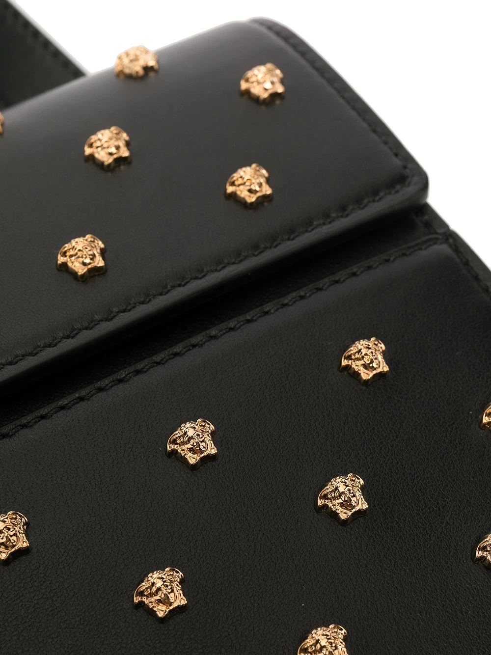 Détails de clous dorés, détail Medusa, logo doré, bride portée épaule ajustable, rabat sur le dessus, poche plaquée sur le devant. Couleur : noir. Matière : cuir.