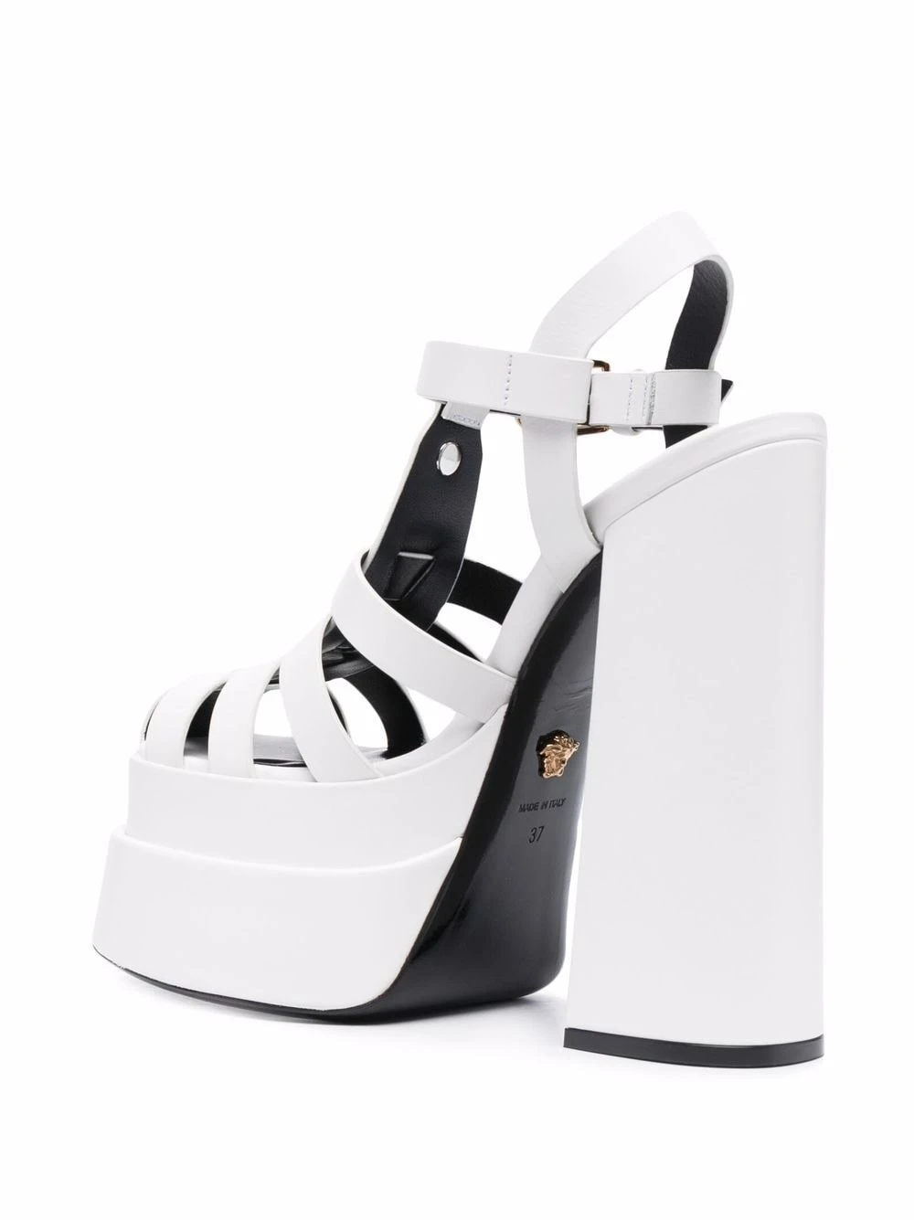 Semelle intérieure à logo, bout ouvert, fermeture à boucles sur les côtés, talon haut épais, finitions en métal doré. Couleur : blanc. Matière : cuir.