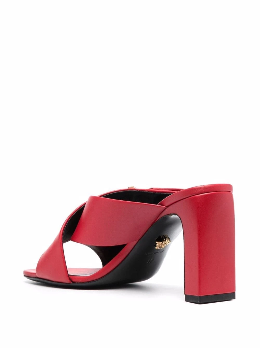 Détail de logo Virtus signature, brides croisées aux orteils, bout ouvert, bout carré, design à enfiler, semelle intérieure griffée, talon haut, semelle en cuir. Couleur : rouge. MatiÚre : cuir de veau.