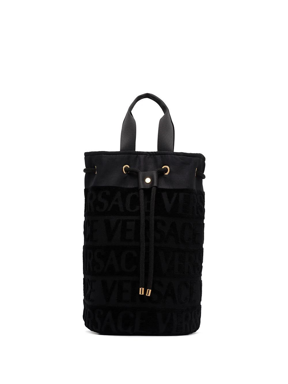 Imprimé monogrammé, fermeture à lien de resserrage, finitions en métal doré, bride porté épaule détachable, anses arrondies. Couleur : noir. Matière : coton.