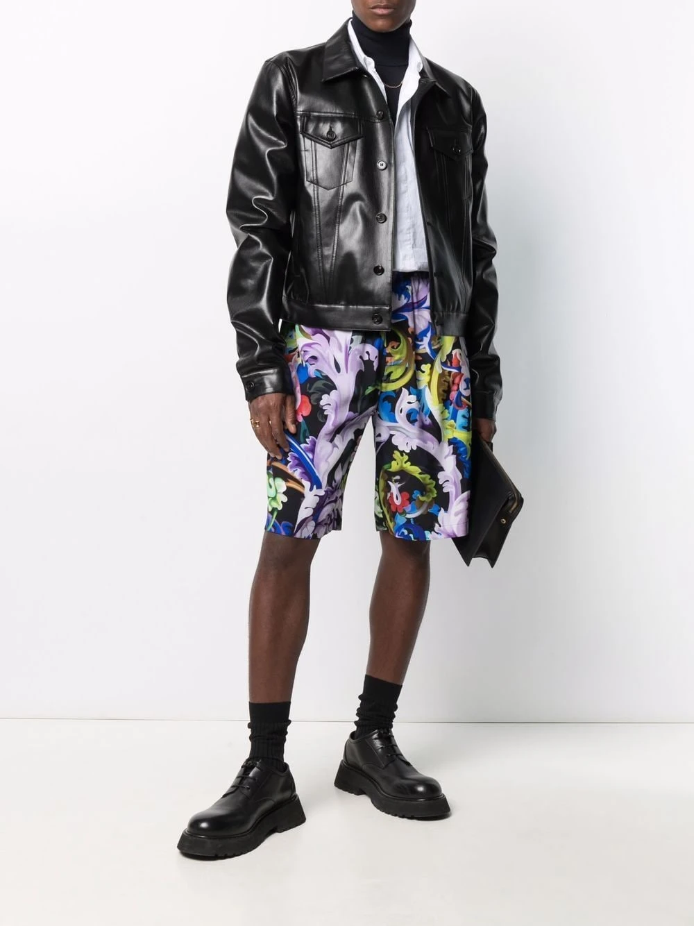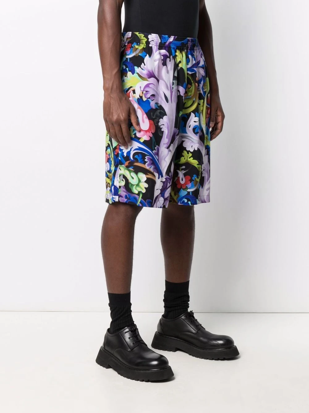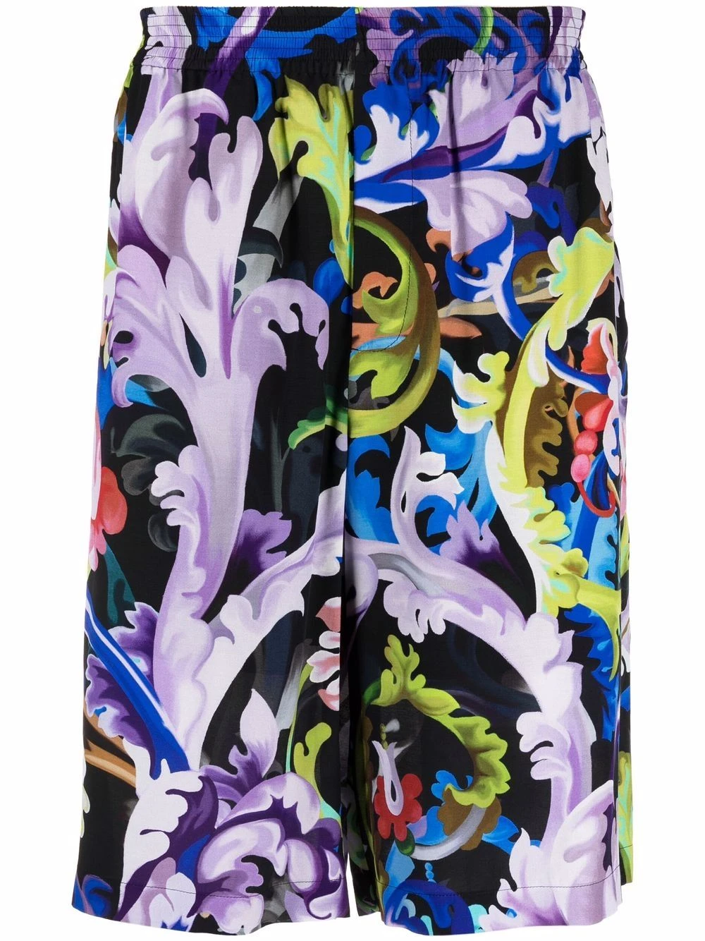 Motif baroque, ceinture élastique, deux poches latérales fendues, poche arrière passepoilée. Couleur : multicolore.