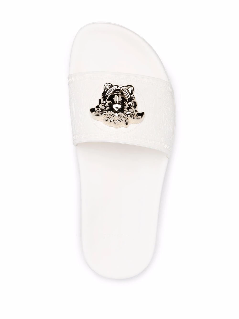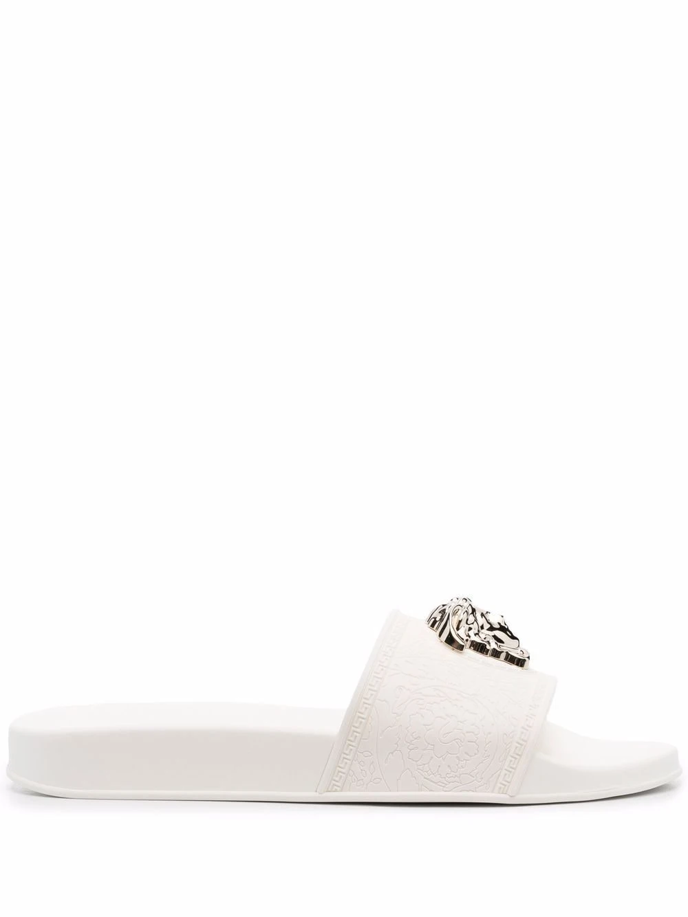 Détail Medusa, bout ouvert, design à enfiler, semelle plate en caoutchouc.