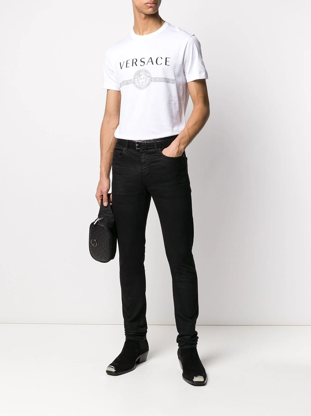 T-shirt à imprimé Medusa en coton Versace avec encolure ronde, manches courtes, imprimé devant et ourlet droit. Couleur : blanc.