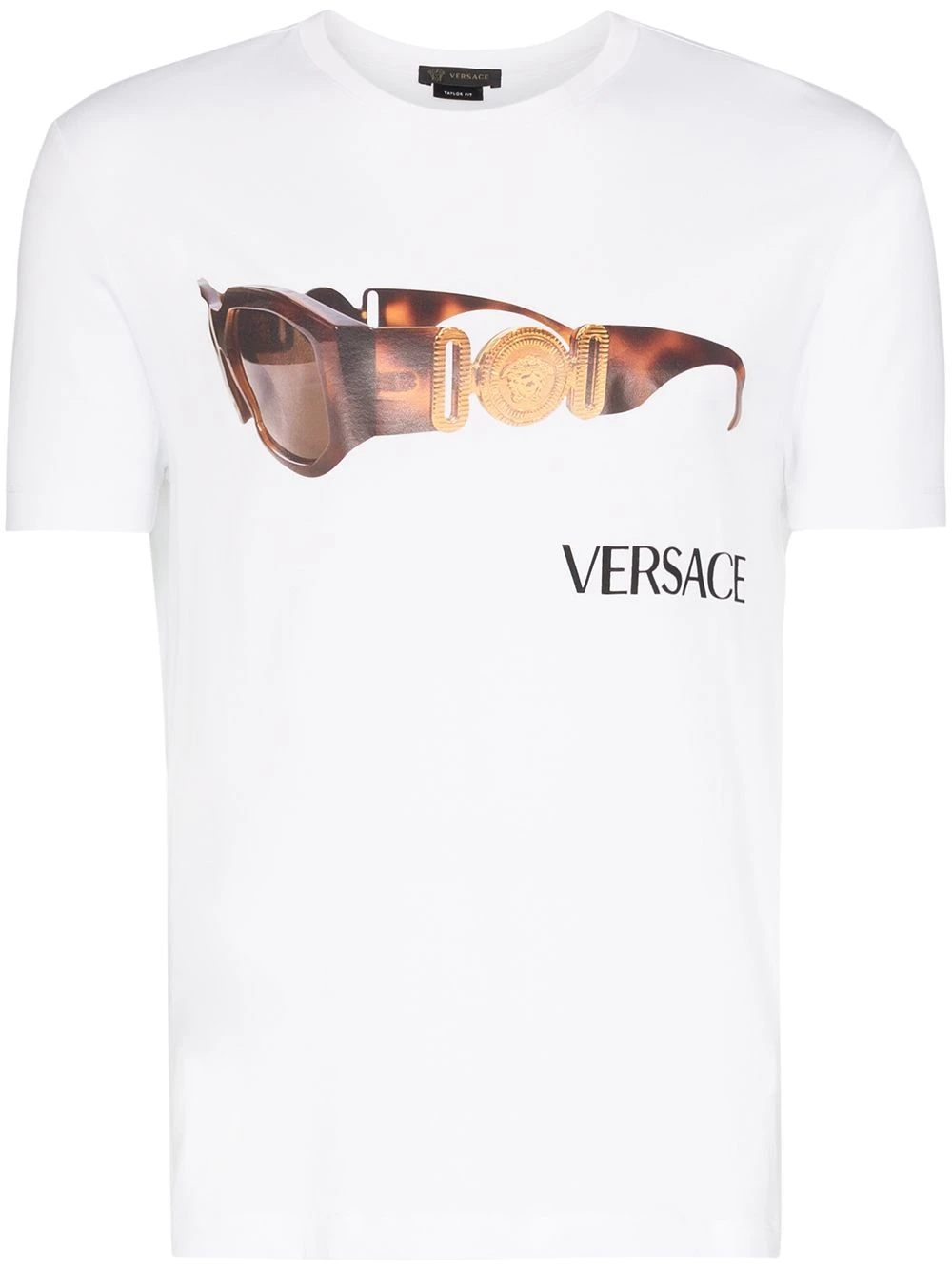 T-shirt à logo imprimé graphique en coton Versace avec encolure ronde nervurée, manches courtes et aspect souple. Couleur : blanc.