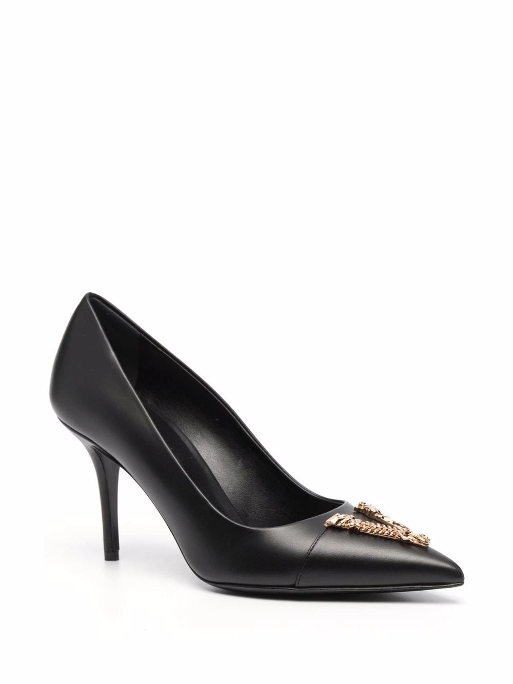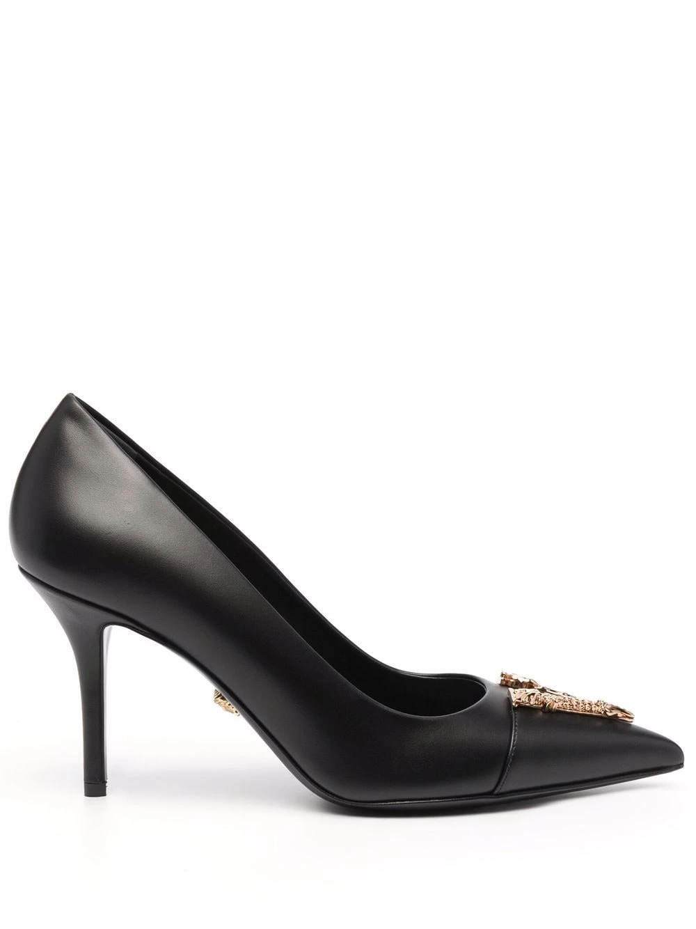 Plaque logo dorée, design à enfiler, bout pointu, talon haut, semelle en cuir. Couleur : noir. Matière : cuir.