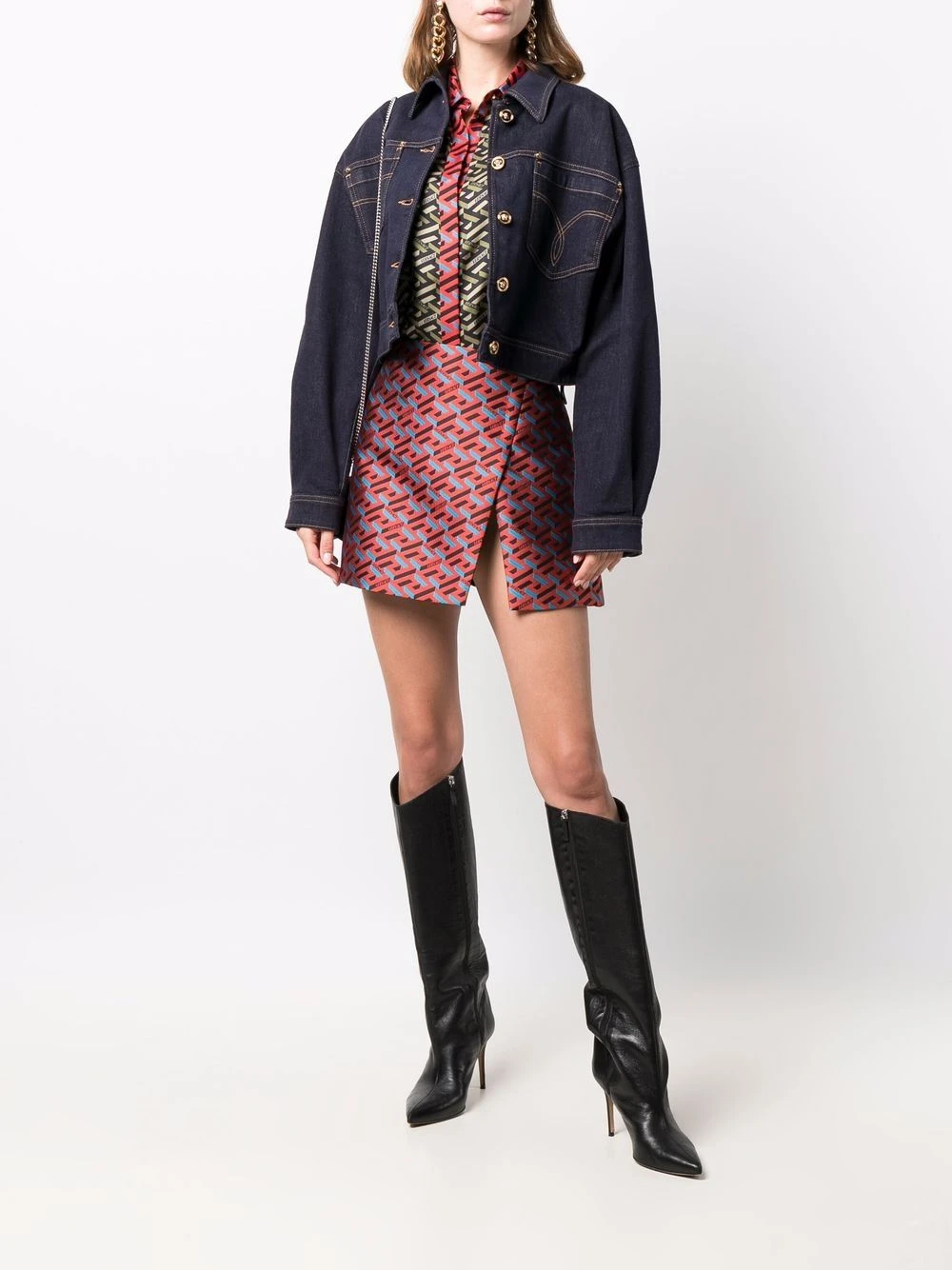 Denim délavé, détail Medusa, coutures contrastantes, col italien, deux poches poitrine plaquées, boutonnière sur le devant, poignets boutonnés.