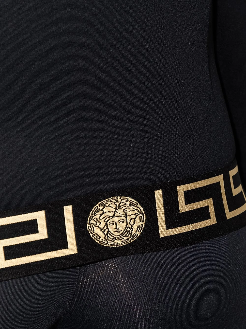 Détail Greca signature, col montant, fermeture zippée devant, manches longues, poignets nervurés, deux poches latérales zippées. Couleur : noir.